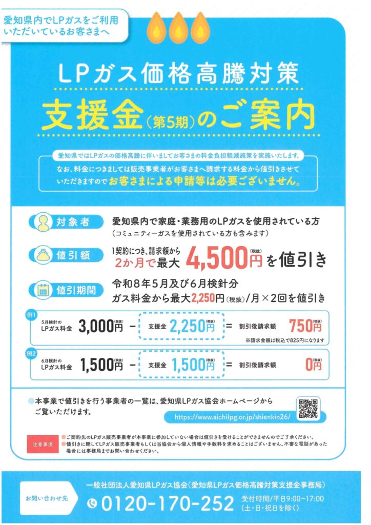 このたび愛知県による「LPガス価格高騰対策支援事業」により、
